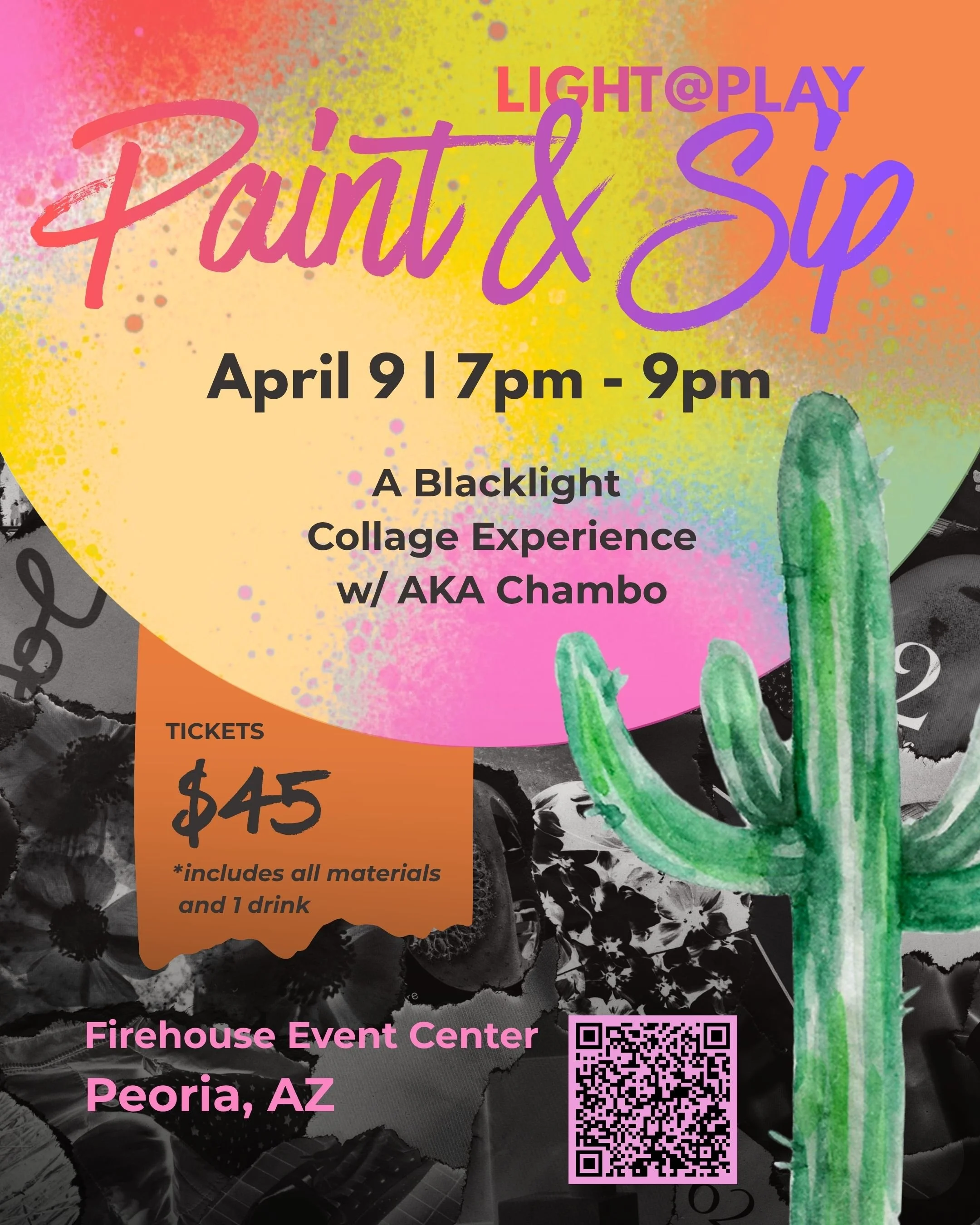 Step into an immersive, glow-in-the-dark creative experience led by Phoenix-based street artist Sean Chambers, AKA Chambo. Known for his raw, layered style and ability to turn emotion into visual storytelling, Sean will guide you through creating a mixed media desert scene that transforms under blacklight.